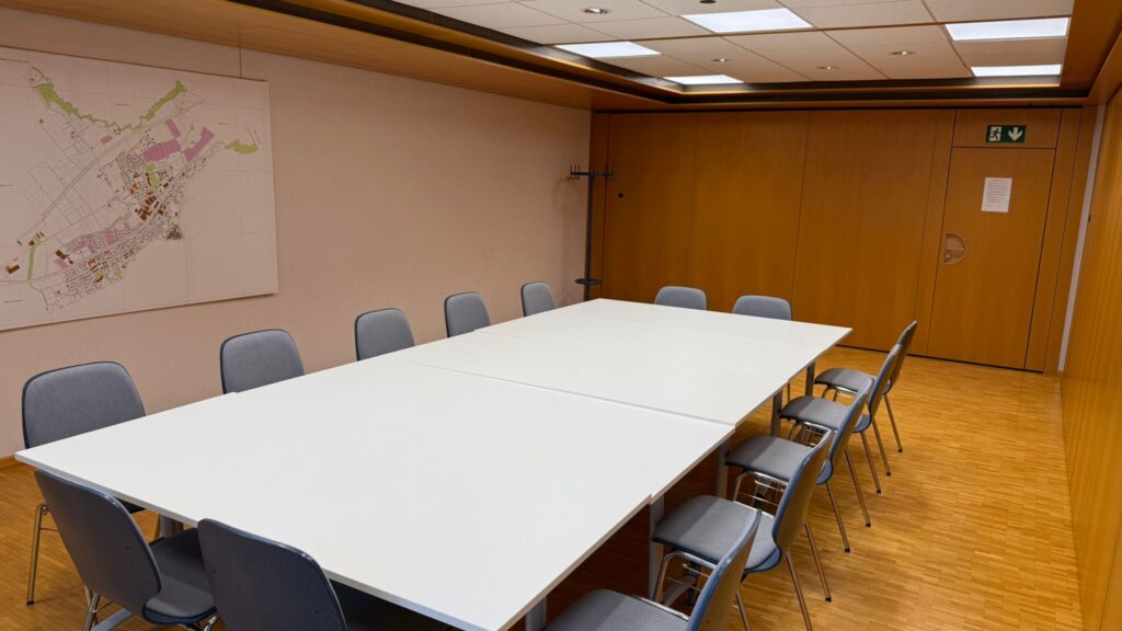 Equipements : 5 tables blanches de 180×80 disposées en rectangle avec 15 chaises autour, complément de chaises dans la salle. Ecran TV sur demande et si disponible.